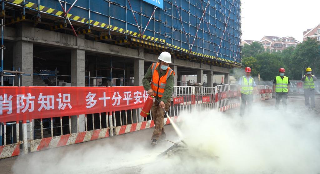 上午9点,演练正式开始。演练模拟了项目施工现场在发现火情后立即启动消防应急救援预案,开展灭火及救援的情形。消防应急救援小组赶到起火点,组织人员撤离,连接消防水枪进行灭火,员工们在演练中平稳有序、临危不乱。演练结束后,项目安全部组织详细讲解了消防安全相关知识,并向现场工人展示了使用干粉灭火器快速有效扑救火灾的步骤流程。