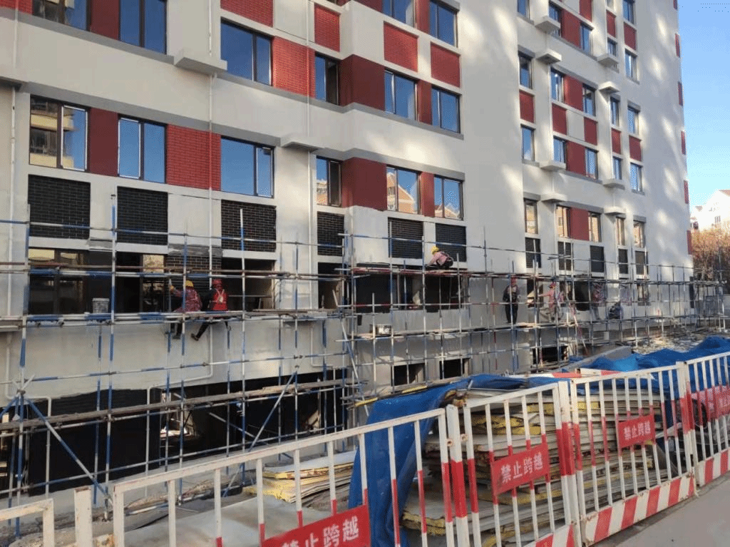 外墙涂料全部施工完成,室外门窗全部安装完成,外脚手架全部拆除。室内地热管线全部敷设完成。 |